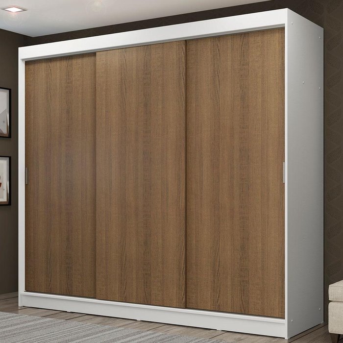 O Guarda-Roupa Kansas da Madesa possui três portas de correr com deslizamento suave, trilhos em alumínio para maior resistência e dois puxadores externos.