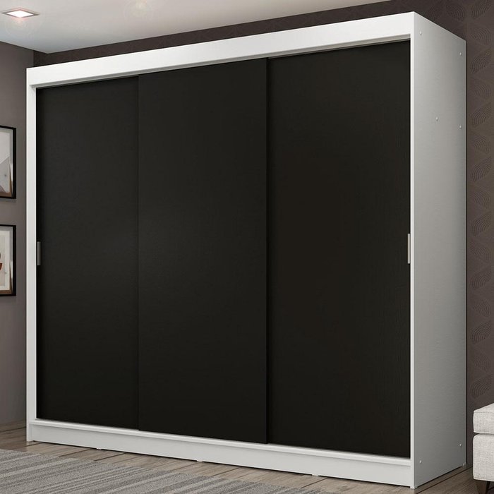 O Guarda-Roupa Kansas da Madesa possui três portas de correr com deslizamento suave, trilhos em alumínio para maior resistência e dois puxadores externos.