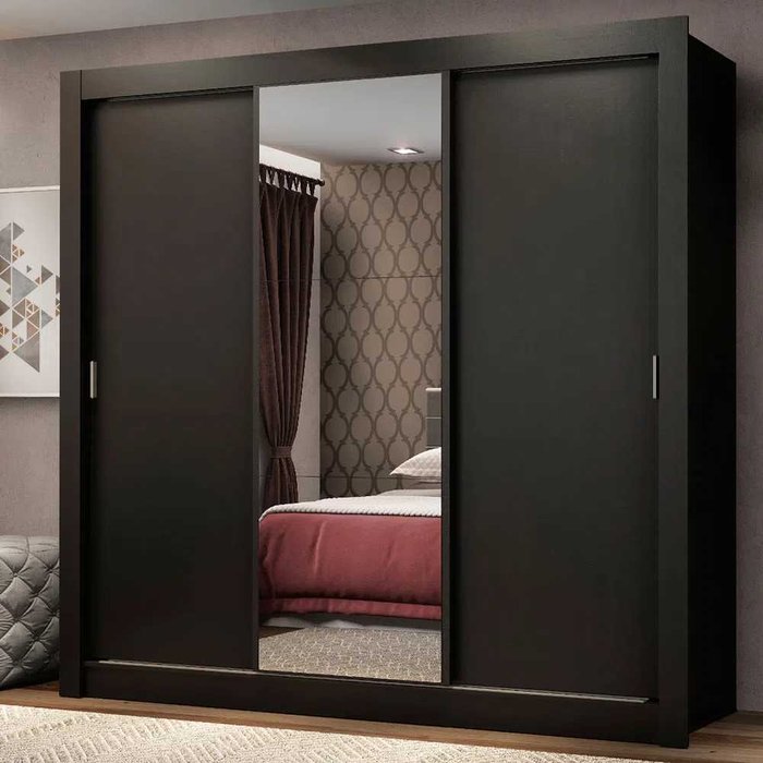 Guarda-Roupa Casal Madesa Mônaco 3 Portas de Correr com Espelho Preto Cor:Preto