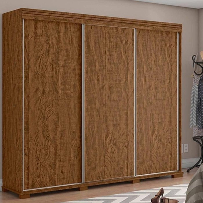 Guarda Roupa Casal Mustang 100% Mdf 3 Portas Correr Com Regulagem Pes De Madeira Castanho Fenix