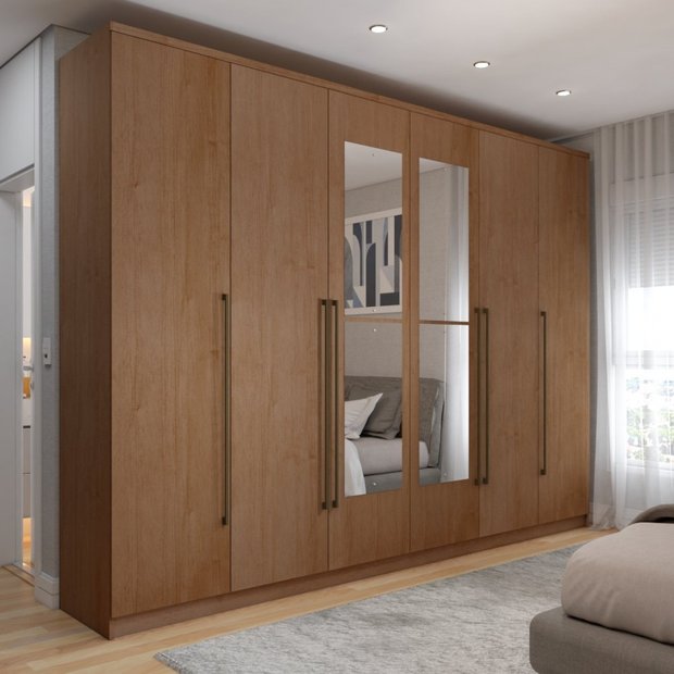 Descrição:O(a) Guarda-Roupa Casal Ravena 6 Portas 8 Gavetas com Espelho Cinamomo - Loja é produzido em MDP na escala de brilho Fosco e Semi-Brilho, e possui um grau de dificuldade de montagem: Médio.Seu revestimento/acabamento é: Pintura UV.Infelizmente a Loja não oferece serviço de montagem, deixamos essa informação bem clara em todas as nossas páginas de produto. Onde especificamos que os móveis chegarão desmontados, e que a montagem fica por conta do cliente.Como não oferecemos esse serviço não embutimos o mesmo no preço dos produtos, ou seja, maior economia para você! Todos os nossos móveis também acompanham o manual de montagem, e caso você queira, pode realizar a montagem você mesmo, sempre especificamos os graus de montagem dos produtos.Nos casos de grau baixo e médio, com pouco ou nenhum conhecimento, você mesmo pode efetuar a montagem, e fazer essa economia. Apenas nos graus de montagem alto, recomendamos a contratação de um montador com experiência, visto que são montagens mais complicadas. A montagem é feita com Parafusos, cavilhas e Minifix..Este móvel é indicado para que seja utilizado no(a) Quarto, dando um toque especial no cômodo de sua casa.Para que você mantenha seu produto sempre em ótimo estado, recomendamos que use apenas um pano seco ou levemente umedecido, sem o uso de quaisquer produtos abrasivos.A Loja garante aos clientes, 90 dias de garantia nos produtos, porém, recomendamos que entre em contato com o fornecedor/marca do produto, pois o mesmo(a), pode garantir um prazo maior de garantia.Lembrando ainda que: quaisquer objetos decorativos que aparecem nas imagens, não acompanham o produto.Características:- Material da Estrutura: MDP- Necessita de Montagem: Sim- Como os Móveis Chegarão na Minha Casa: Desmontado em caixas, acompanhado de todas as peças, ferragens e manuais para montagem.- Grau de Dificuldade da Montagem: Médio- Sistema de Montagem: Parafusos, cavilhas e Minifix.- Observação: Objetos decorativos que aparecem nas imagens, não acompanham o produto.- Recomendação de Manutenção: Utilizar pano levemente umedecido, seguido de pano seco. Não utilizar quaisquer produtos abrasivos.- Indicação de Uso: Quarto- Garantia (dias): 90- Escala de Brilho: Fosco e Semi-Brilho- Acompanha: Guarda-Roupa + Kit Ferragens + Manual de Montagem- Material do Cabideiro: Alumínio- Peso Suportado no Cabideiro (Kg): 10- Possui Sapatas?: Não- Modelo: Casal- Quantidade de Cabideiros: 3- Revestimento /Acabamento: Pintura UV- Possui Rodízios?: Não- Quantidade de Portas: 6- Tipo de Porta: Portas de Bater- Quantidade de Gavetas: 8- Possui Espelho?: Sim- Possui Vidro?: Não- Peso Suportado nas Gavetas (Kg): 5 Kg- Material das Corrediças: Metálica- Material das Dobradiças: Metálica- Material do Puxador: Alumínio- Espessura da Estrutura: 15mm- Possui Gavetas?: Sim- Tipo da Corrediça: Telescópica- Possui Portas?: Sim- Material da Porta: MDP- Espessura da Porta: 15 mm- Altura do Espelho: 84 Cm- Largura do Espelho: 25 Cm- Espessura do Espelho: 0,3 Cm- Quantidade de Prateleiras: 10- Peso Suportado nas Prateleiras:: 10 Kg- Tipo de Guarda-Roupa/Closet: Convencional- Montagem Invertida?: Não Pode ser Montado Invertido- Possui Prateleiras?: Sim- Possui Puxadores?: Sim- Possui Pés?: Não- É frágil?: Não- Possui Ripamento?: Não- Com Nichos?: Não- Acompanha Manual de Montagem: Sim- Possui Nicho?: NãoDimensões:- Altura: 234,20 cm- Largura: 270,00 cm- Profundidade: 55,50 cm- Peso: 223,930 kg