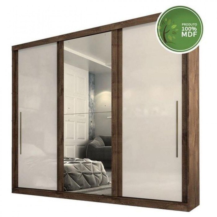Guarda-roupa 3 portas de correr, sendo a central com espelhos parafusado, 4 gavetas internas com corrediças telescópicas, 3 cabideiros com suportes e trilho em alumínio, 7 prateleiras.