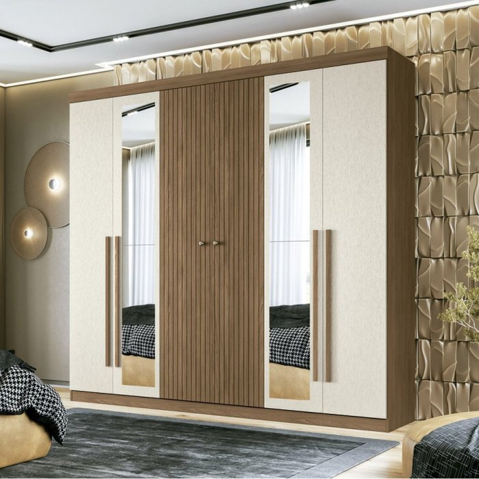 Guarda Roupa Casal Ripado 6 Portas 4 Gavetas Antony com Espelhos Jatoba/Areia