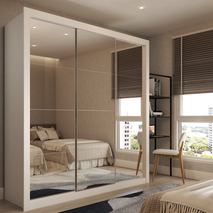 O(a) Guarda-Roupa Casal Santos 3 Portas de Correr 4 Gavetas Espelhado Branco - Panorama Móveis é produzido em MDP na escala de brilho Brilho, e possui um grau de dificuldade de montagem: Médio.