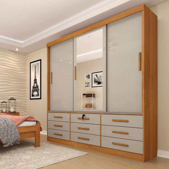 Guarda Roupa Chicago 3 Portas 9 Gavetas com Espelho - Tcil - Cinamomo/off White