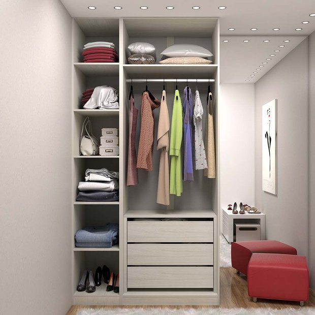 Para quem deseja personalizar seu espaço com praticidade, conforto e modernidade, a linha de Dormitórios Closet Prime traz soluções com várias possibilidades. Para organizar suas roupas, sapatos e acessórios de forma prática com tudo acessível para hora de se arrumar, além de manter tudo sempre arejados. O ambiente fica completo com gavetas, cabideiro e prateleiras. Os módulos são peças individuais o que permite montar e acomodar da forma que melhor se adequar ao espaço disponível. Para esta proposta usamos 120,7cm de parede.
