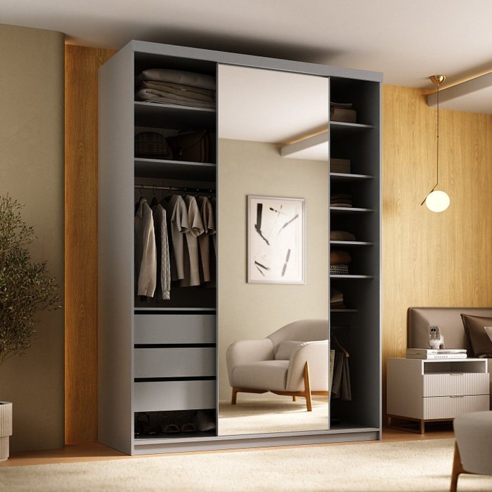 Conta com gavetas com corrediças telescópicas para deslizamento suave, além de espelho inteiriço na porta de correr, que traz elegância e amplitude ao quarto. Sua distribuição interna inteligente facilita a organização do dia a dia, oferecendo qualidade de móveis planejados em um produto pronto para transformar seu espaço.