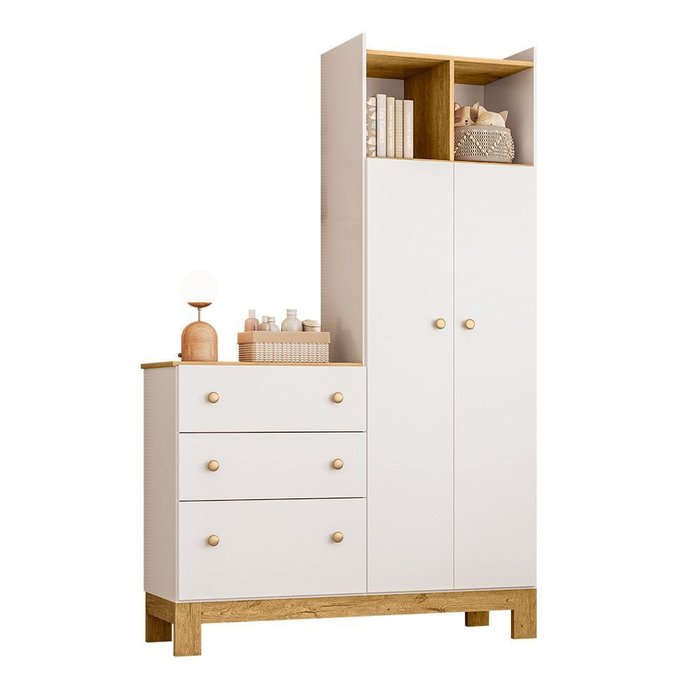 O Guarda Roupa com Cômoda Q Encanto Slim é perfeito para acomodar os objetos do bebê com praticidade e comodidade, com seu amplo espaço interno e composição de três gavetas.