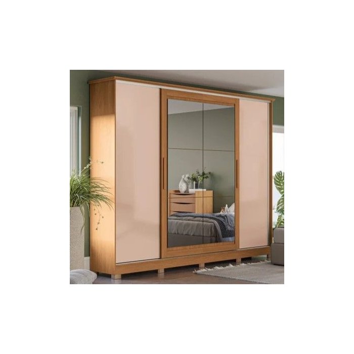 Guarda Roupa com Espelho e Pés 4 Portas de Correr 4 Gavetas Canela/Macadâmia