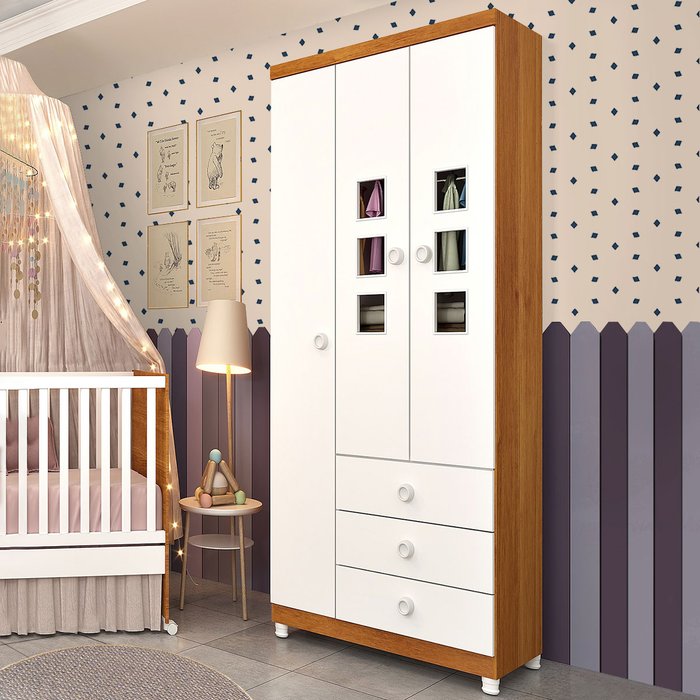Guarda-Roupa de Bebê Sonic 3 Portas 3 Gavetas com Pés Cinamomo/Neve - Tcil Móveis