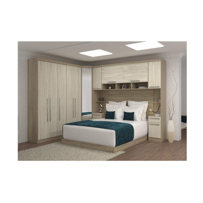 Um quarto completo com tudo que você precisa. Canto amplo com prateleiras aproveitando até aquele espaço que parecia sem utilidade. Ainda conta com uma porta com moldura em alumínio e espelho. Guarda-Roupas contém prateleiras e cabideiros, os criados mudos altos com gavetas e prateleiras, cabeceira em painel para cama box de 138cm de largura. Quarto completo pensado para atender um casal. Os módulos podem ser montados em várias posições, adequando-se ao seu espaço.