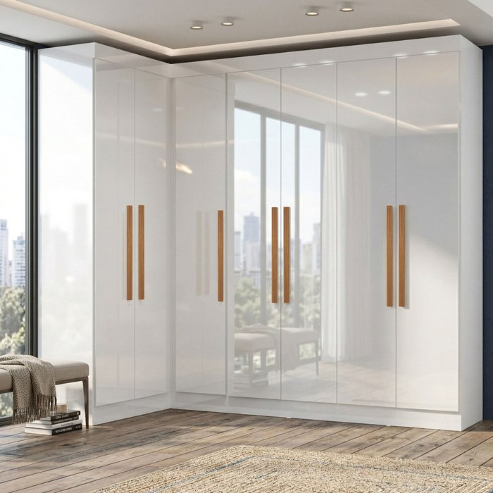 - Guarda-roupa de canto: o guarda-roupa de canto é desenvolvido para usar de forma inteligente os espaços de duas paredes, aproveitando, inclusive, os cantos. Ideal para quem não tem muito espaço disponível ou para quem quer otimizar todos os espaços da melhor forma.