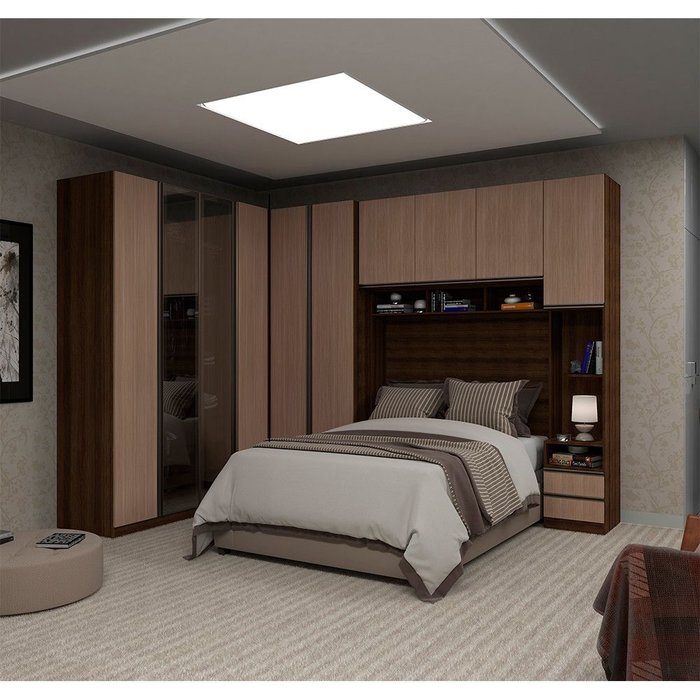 O Guarda Roupa de Canto aproveita aquele espaço que parece sem utilidade, a Linha Modulada Prime foi desenvolvida adequando-se a vários espaços, de grandes a pequenos, pois seus módulos possuem 236 cm de altura oferecendo divisórias para atender diversas necessidades, com profundidade de 56cm possibilitando acomodar roupas sem amassar, possui 3 amplas gavetas. A Ponte Modulada possui145cm, para utilização com colchão Casal de 138cm de largura. Ainda conta com armários, Mesa de Cabeceira altos com prateleiras e 2 gavetas. Os módulos são peças individuais o que permite montar e acomodar da forma que melhor se adequar ao espaço disponível. Produzido em MDP de 15mm, dobradiças reforçadas em 35mm e corrediças telescópicas em todas as gavetas que possibilitam abertura total. Para esta proposta usamos as medidas de parede: Lado Cabeceira 323cm X 220,2cm.