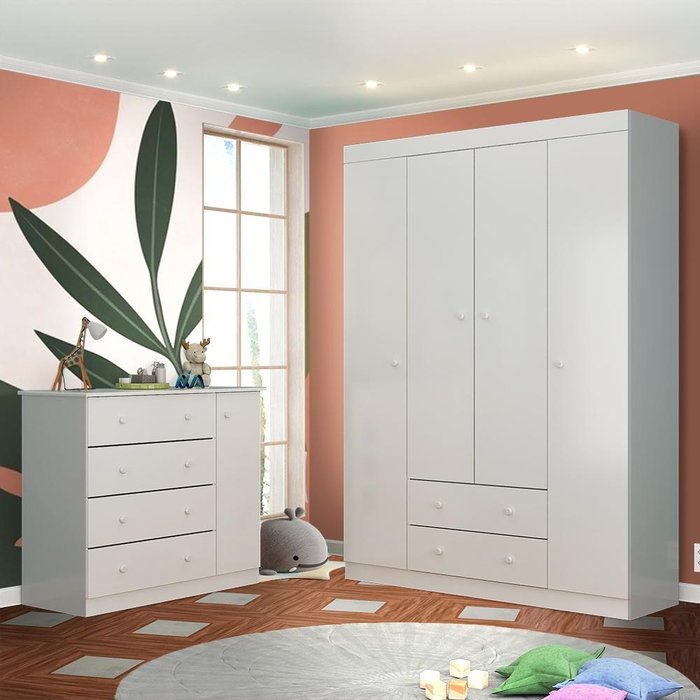 Dimensões do guarda roupa: Largura 147 cm; Profundidade 45 cm; Altura 203 cm; Dimensões da cômoda: Largura 105 cm; Profundidade 45 cm; Altura 92 cm; Itens Inclusos: 1 guarda roupa e 1 cômoda Organização completa e encantadora para o quarto do seu bebê! Nossa cômoda e nosso guarda-roupa oferecem espaços amplos e inteligentes para roupas, fraldas e acessórios. Com design elegante e materiais duráveis, os móveis se adaptam perfeitamente ao ambiente. Desfrute do máximo de praticidade e versatilidade, criando um espaço organizado e encantador para seu bebê. * Detalhes do guarda roupa * - Estrutura 100% MDP - 4 portas com excelente espaço interno - Cabideiro metálico - 2 gavetas - Corrediças telescópicas - Nichos e prateleiras internas - Puxadores em PVC * Detalhes da cômoda * - Estrutura 100% MDP - 4 gavetas com excelente espaço interno - Corrediças telescópicas - 1 porta com nichos internos - Cabideiro metálico - Puxadores em PVC Complexidade da montagem: Média, pode ser montado por mais de uma pessoa e/ou necessite de maior conhecimento para montagem. Recomendações de uso, manutenção e limpeza: Limpar com flanela ou pano macio seco, não utilizar produtos abrasivos, desengordurantes, álcool ou solvente. Não expor o produto diretamente a luz solar e à umidade Garantia: 3 meses