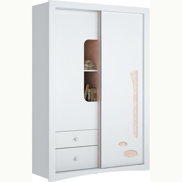 - Guarda-Roupa infantil fabricado em MDP/MDF, possui 1 porta de bater e 1 porta de correr, 2 gavetas externas, 6 prateleiras, 2 cabideiros e acabamento brilho.
