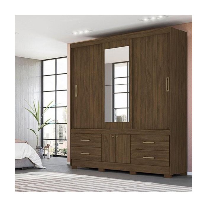 O Guarda-Roupa Florida é feito em MDF, possui acabamento em impressão UV e tem espelhos fixados na porta. São, 3 portas e 2 gavetas externas com corrediças telescópicas. Além disso o produto conta com puxadores na cor bronze, portas inferiores com opção de sapateiras e pés em PVC.