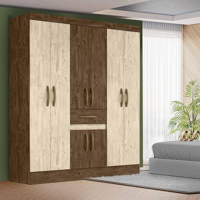Dimensões do produto: Altura 204 cm; Largura 165 cm; Profundidade 47 cm; Itens Inclusos: 1 guarda-roupas- Produzido em MDP- 8 portas- 1 gaveta com corrediças metálicas- 1 cabideiro em alumínio- 1 calceiro em alumínio- Puxadores na cor bronze- Prateleiras e nichos internos- Pés em PVC com montagem opcional- Excelente espaço para roupas, sapatos, roupas de cama e acessóriosComplexidade da montagem: Média, pode ser montado por apenas uma pessoa e/ou necessite de maior conhecimento para montagem.Recomendações de uso, manutenção e limpeza: Limpar com flanela ou pano macio seco, não utilizar produtos abrasivos, desengordurantes, álcool ou solvente. Não expor o produto diretamente a luz solar e à umidadeGarantia: 3 mesesOBS: Foto meramente ilustrativa, objetos, utensílios e decoração não fazem parte do produto.