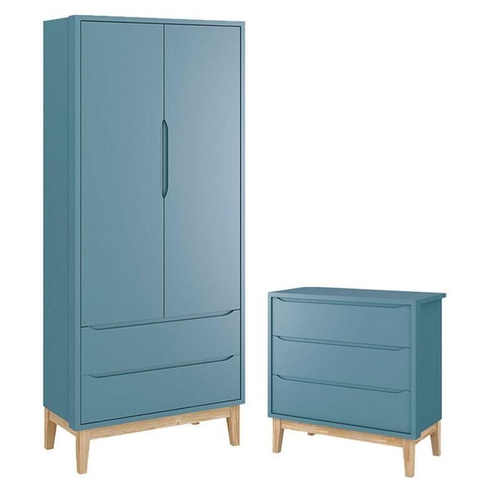 Guarda Roupa Infantil 2 Portas e Cômoda Gaveteiro New Classic Azul com Pés Madeira Natural – Reller