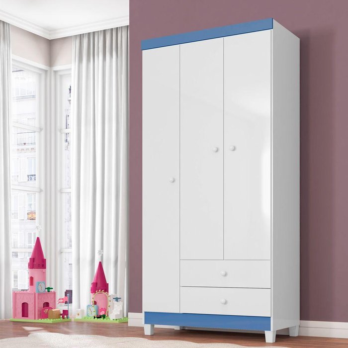 Guarda Roupa Infantil 3 Portas 2 Gavetas Branco Azul Branco