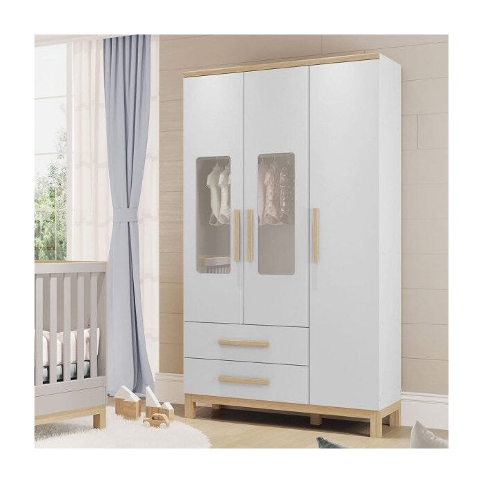 O Armário Louis 3 Portas é um produto 100% MDF. Com pintura atóxica e espaço interno pensado para guardar as roupinhas e objetos do dia a dia com comodidade em suas 5 prateleiras e 1 cabideiro metálico. Os puxadores, pés e molduras são em MDF revestido. Portas Janeladas com detalhes em acrílico PETG Cristal e gavetas com corrediças telescópicas para maior segurança e deslize suave.