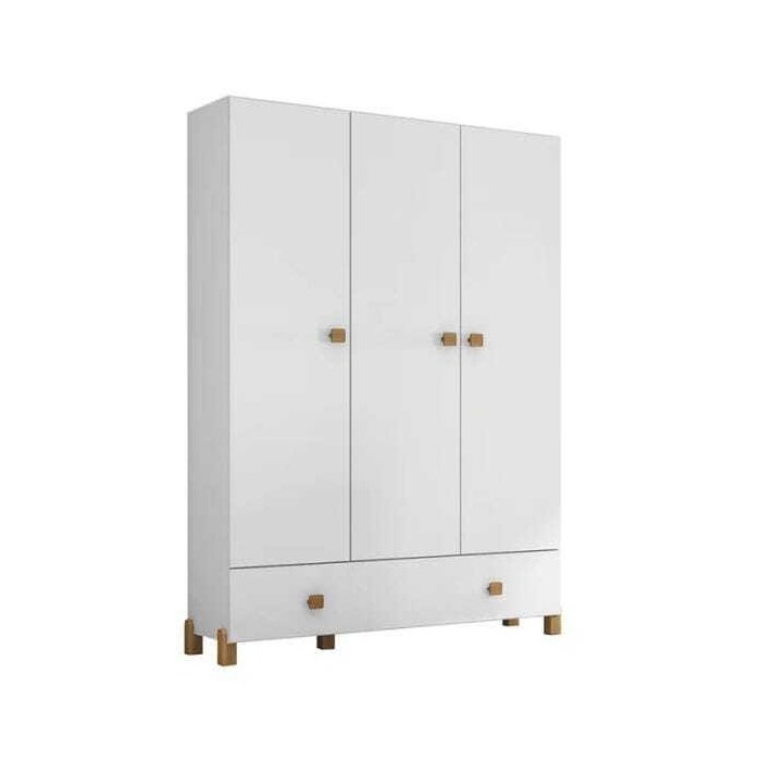Guarda-Roupa infantil, ideal para quem busca modernidade e sofisticação ao quarto do bebê. Estrutura 100% em MDF de 15mm, laterais e contra fundos das gavetas de 12mm, feito com material ecológicamente correto, para melhor durabilidade e resistência à peça, contando com pintura atóxica em acabamento UV acetinado. Composto por 3 portas de bater com dobradiças metálicas, 01 gavetão externo duplo com corrediça telescópica, cantoneira, sistema antitombamento, prateleiras internas, cabideiro metálico, puxadores em madeira, e pés fixos em madeira. Este móvel chegará em sua casa separado em 3 volumes.