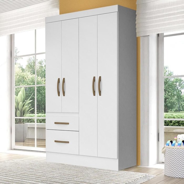 Dimensões do produto: Altura 204 cm; Largura 110 cm; Profundidade 47 cm; Itens Inclusos: 1 guarda-roupas - Produzido em MDP - 4 portas - 2 gavetas com corrediças metálicas - 1 cabideiro - Puxadores na cor bronze - Prateleiras e nichos internos - Excelente espaço para roupas, sapatos, roupas de cama e acessórios - Pés em PVC com montagem opcional - Este produto possui detalhes com diferentes opções de cores (branco, rosa, azul e lilás), permitindo que você selecione a cor de sua preferência no momento da montagem. Complexidade da montagem: Média, pode ser montado por apenas uma pessoa e/ou necessite de maior conhecimento para montagem. Recomendações de uso, manutenção e limpeza: Limpar com flanela ou pano macio seco, não utilizar produtos abrasivos, desengordurantes, álcool ou solvente. Não expor o produto diretamente a luz solar e à umidade Garantia: 3 meses OBS: Foto meramente ilustrativa, objetos, utensílios e decoração não fazem parte do produto. Cor: Branco | Altura: 204 | Altura do Produto com Embalagem: 204 | Largura: 110 | Largura do Produto Com Embalagem: 110 | Peso do Produto: 67 | Peso Produto Com Embalagem: 67 | Comprimento do Produto: 47 | Comprimento do Produto Com Embalagem: 47 | Descrição do Tamanho: Altura 204 cm; Largura 110 cm; Profundidade 47 cm | Material: MDP