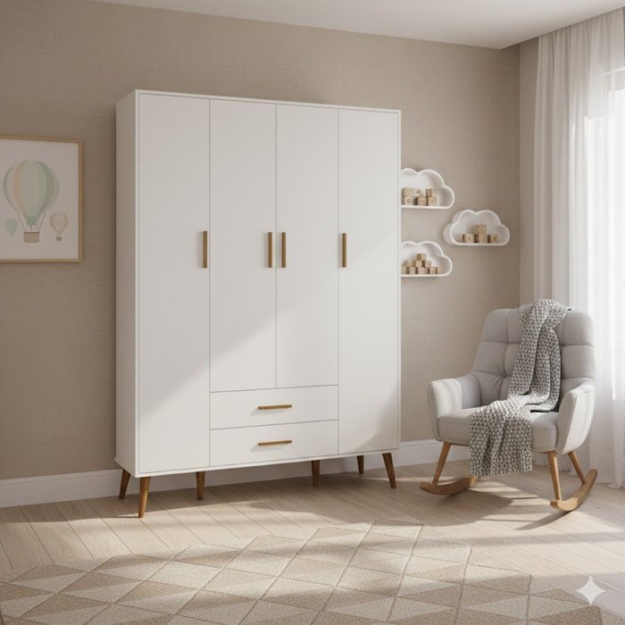 O Guarda-Roupa Retrô 4 Portas Isis - MóveisAqui introduz um estilo retrô com os pés em madeira maciça, apresenta um desing clean que combina com vários estilos de decoração. Possui um espaço amplo e com divisórias internas para que as roupinhas do bebê possam ser organizadas e armazenadas com comodidade,puxadores em MDF envelopado.
