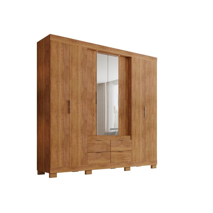 Estrutura do produto: MDF e MDP 12 e 15 mm, 8 portas articuladas, sendo 2 Portas centrais com espelhos, 4 gavetas Externas com corrediças telescópicas, Puxadores e Cabideiros em Alumínio, Com Luz de Led, pés em PVC.