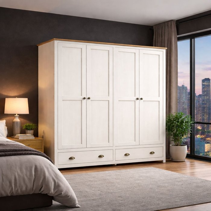 Seu design equilibrado e atemporal torna este modelo ideal para quartos que exigem organização eficiente sem excesso visual. As quatro portas permitem uma distribuição interna prática, enquanto as duas gavetas espaçosas facilitam o armazenamento de roupas e acessórios do dia a dia.