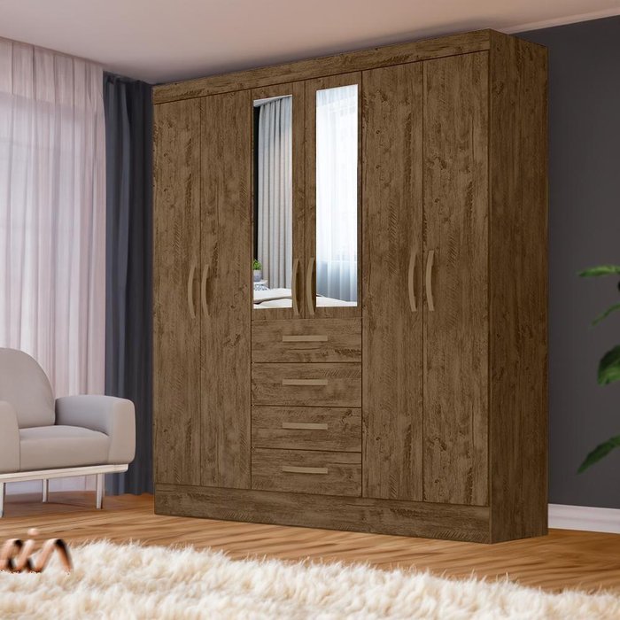 Dimensões do produto: Altura 204 cm; Largura 177 cm; Profundidade 47 cm; Itens Inclusos: 1 Guarda Roupa - Material em MDP - 6 Portas de giro com puxadores na cor bronze - 2 Espelhos nas portas centrais do guarda roupa - 4 Gavetas com corrediças metálicas com puxadores na cor bronze - 4 Nichos com um excelente espaço para armazenamento, proporcionando otimização de espaço - 3 Cabideiros em alumínio - Pés em PVC com montagem opcional Complexidade da montagem: Média, pode ser montado por apenas uma pessoa e/ou necessite de maior conhecimento para montagem. Recomendações de uso, manutenção e limpeza: Limpar com flanela ou pano macio seco, não utilizar produtos abrasivos, desengordurantes, álcool ou solvente. Não expor o produto diretamente a luz solar e à umidade Garantia: 3 meses OBS: Foto meramente ilustrativa, objetos, utensílios e decoração não fazem parte do produto. Fabricante: Shop Jm | Cor: Castanho | Largura: 177 | Tonalidade: Marrom | Garantia do Fabricante: 3 | Altura: 204 | Peso do Produto: 123 | Produto: 7891904150693 | Comprimento: 204 | Peso: 123 | Estado de Origem: São Paulo | Material: MDP | Peso Montado: 123 | Largura Montado: 177 | Profundidade Montado: 47 | Altura Montado: 204