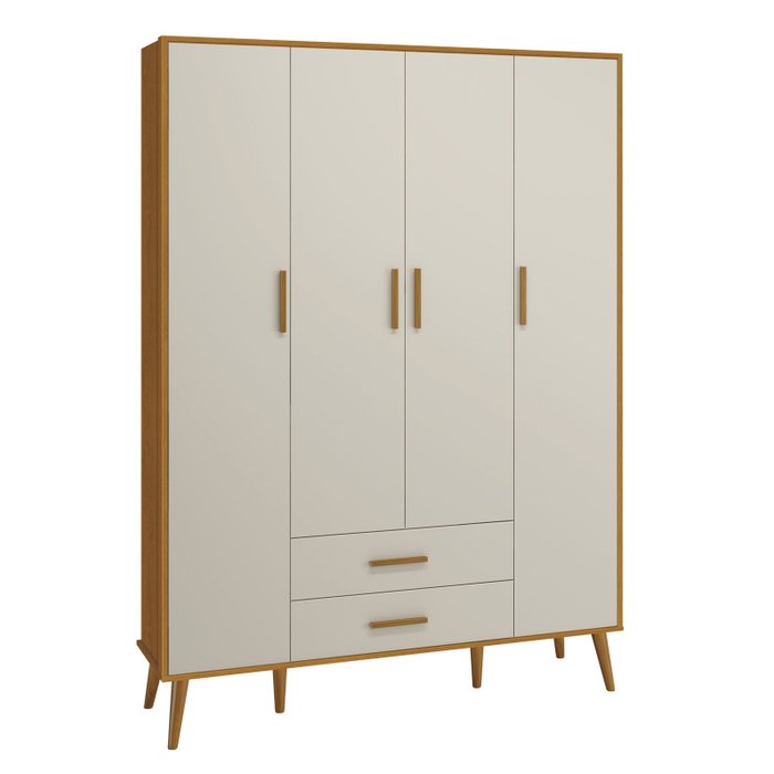 O Guarda-Roupa Retrô 4 Portas Isis - MóveisAqui introduz um estilo retrô com os pés em madeira maciça, apresenta um desing clean que combina com vários estilos de decoração. Possui um espaço amplo e com divisórias internas para que as roupinhas do bebê possam ser organizadas e armazenadas com comodidade,puxadores em MDF envelopado.