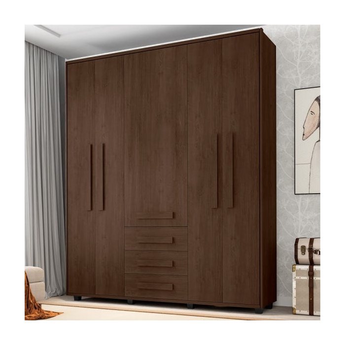 Guarda-Roupa 5 Portas e Gavetas Olívia NoceO Guarda-Roupa 5 Portas e Gavetas Olívia é ótimo para você que quer um quarto mais organizado, bonito e aconchegante!Com 5 portas e 3 gavetas, possui amplo espaço interno e divisórias que facilitam a organização e praticidade.Possui também acabamento Interno na mesma cor do produto e moldura de 20mm.Medidas Do Produto:Altura: 225,8cmComprimento: 45cmLargura: 190cmInformações Complementares:Gavetas: Sim (3 gavetas com corrediças telescópicas)Prateleiras: Sim (3 prateleiras internas)Maleiro: Sim (3)Pés: Sim (8)Calceiro, Cabideiro e trilhos: Sim (em alumínio)Itens Inclusos:- 01 Guarda-Roupa 5 Portas e Gavetas Olívia;- Kit completo para montagem, Manual detalhado de instruções para montagemGarantia3 meses contra defeito de fabricaçãoInformações Adicionais:- Fotos meramente ilustrativas do produto no ambiente.- Os objetos que ambientam as fotos não acompanham o produto;- Verificar descrição e tamanho do produto antes da compra.- Avaliar a mercadoria no ato do recebimento e recusar em caso de divergência ou avarias.- Mantenha as informações de contato e endereço de entrega atualizados para entrarmos em contato caso necessário.- Limpar com flanela ou pano macio seco, não utilizar produtos abrasivos, desengordurantes, álcool ou solvente. Não expor o produto diretamente à luz solar e à umidade. Sugerimos a contratação de um montador profissional para a montagem do produto. Não nos responsabilizamos por avarias causadas no ato da montagem. Não nos responsabilizamos pela montagem e desmontagem do produto no ato da entrega e devolução, assim como os custos gerados nestas situações. A transportadora entregará o produto no andar térreo do endereço de entrega. Não nos responsabilizamos por subir escadas, corredores e elevadores ou transporte por guincho em apartamentos.