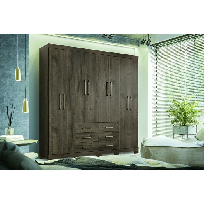 Itens Inclusos: 1 Guarda RoupaO Guarda Roupa Liverpool da Santos Andirá é um móvel prático e funcional, e se encaixa em qualquer ambiente do quarto de casal ou solteiro. Com 8 portas e 6 gavetas, esse roupeiro garante muito espaço para guardar todas as roupas. Puxadores em ABS garantem um design moderno. Internamente, possui amplas prateleiras para guardar todas as roupas de forma organizada, assim como edredons, cobertores, caixas, travesseiros, decoração, etc. Possui 3 cabideiros em alumínio para pendurar todas as roupas (casacos, vestidos, camisas, blusas) com muita organização e segurança. O acabamento na cor madeirada é com verniz fosco, tudo dentro dos padrões de preservação do meio ambiente. Possui pés em PVC, que permitem elevar o móvel do chão, facilitando a limpeza embaixo dele. Um guarda roupa de casal completo e muito prático para o seu quarto!Complexidade da montagem: Média, pode ser montado por mais de uma pessoa e/ou necessite de maior conhecimento para montagem.