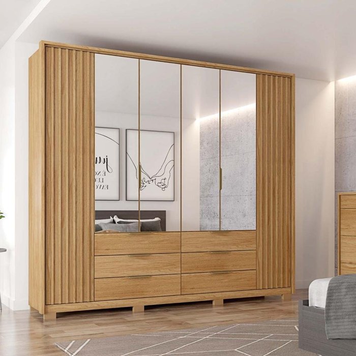 O Guarda Roupa é excelente para organizar suas roupas e manter o ambiente bonito e confortável. Contém 4 espelhos, 6 Gavetas, 10 Prateleiras para se adaptar melhor ao seu quarto e agregar beleza ao cômodo. Tornando-se uma ótima escolha para quem busca praticidade e elegância! Especificações: - Comprimento: 268 cm - Largura: 57 cm - Altura: 234,2 cm - 6 Gavetas - 10 Prateleiras - Material: HDF MDP - Cor: Buriti - As configurações do seu monitor ou dispositivo móvel podem afetar a tonalidade da cor do produto. Conferir na descrição. - Recomendação de Limpeza: Limpar com pano seco para retirar o pó. Não aplicar produtos abrasivos. - Produtos de Enfeite e Eletrônicos Não Estão Inclusos.