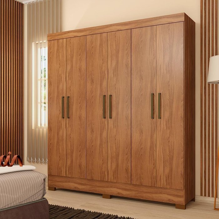 Dimensões do produto: Largura 180 cm; Profundidade 47 cm; Altura 207 cm; Itens Inclusos: 1 Guarda Roupa - Material da estrutura em MDP - 06 Portas com excelente espaço interno e puxadores vero na cor bronze - 3 Cabideiros em alumínio - 2 Gavetas internas centrais com corrediças metálicas e puxadores embutidos - Divisórias internas espaçosas - Sapateiras amplas para melhor organização - Pés em PVC que facilitam a limpeza do ambiente Complexidade da montagem: Média, pode ser montado por mais de uma pessoa e/ou necessite de maior conhecimento para montagem. Recomendações de uso, manutenção e limpeza: Limpar com flanela ou pano macio seco, não utilizar produtos abrasivos, desengordurantes, álcool ou solvente. Não expor o produto diretamente a luz solar e à umidade Garantia: 3 meses