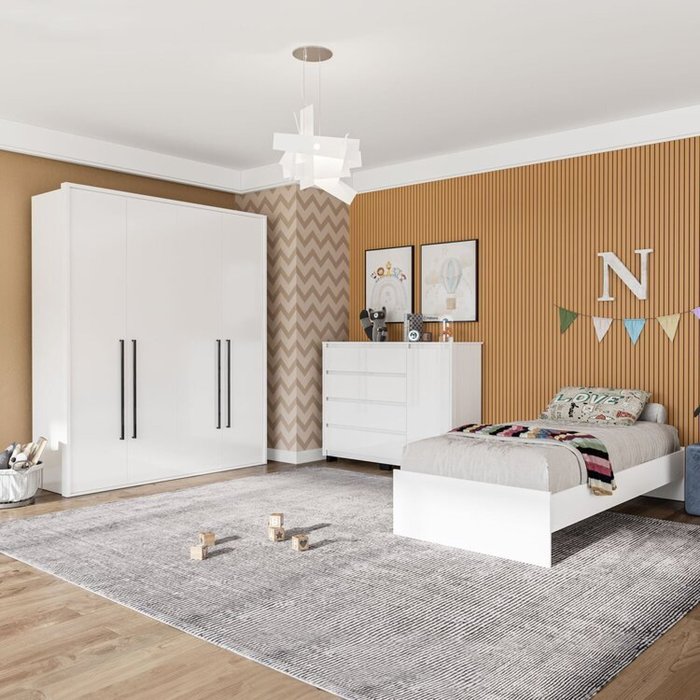 Guarda-roupa Sevilha 4 Portas Cômoda 4 Gavetas 1 Porta Cama Infanto Juvenil Solteiro Branco