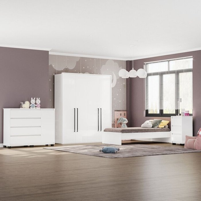 Guarda-roupa Sevilha 4 Portas Cômoda 4 Gavetas 1 Porta Mesa de Cabeceira 3 Gavetas Cama Infanto Juve Branco