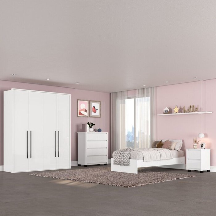 Guarda-roupa Sevilha 4 Portas Cômoda 4 Gavetas Mesa de Cabeceira 2 Gavetas Cama Infanto Juvenil Branco