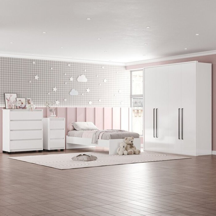 Guarda-roupa Sevilha 4 Portas Cômoda 4 Gavetas Mesa de Cabeceira 3 Gavetas Cama Infanto Juvenil Branco