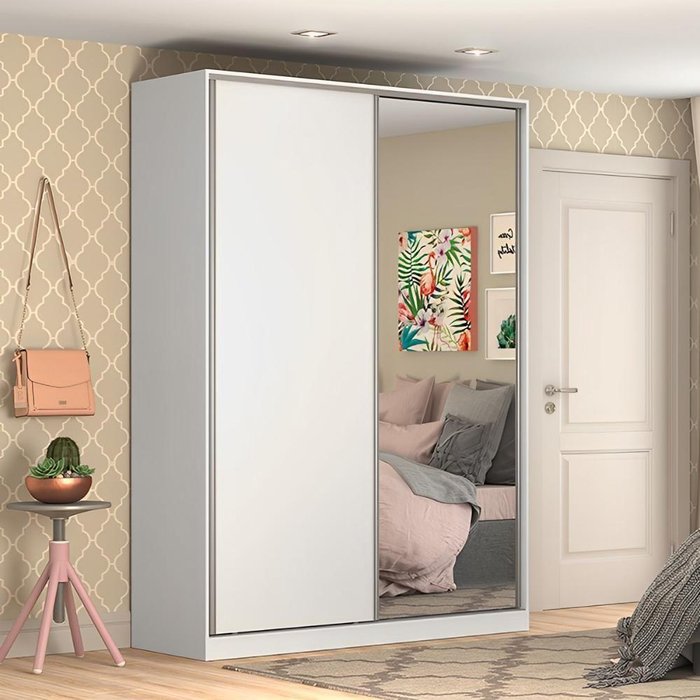 Guarda Roupa Solteiro 1,65m Com Espelho 2 Portas 100% Mdf Cor:branco Com Espelho Branco Com Espelho