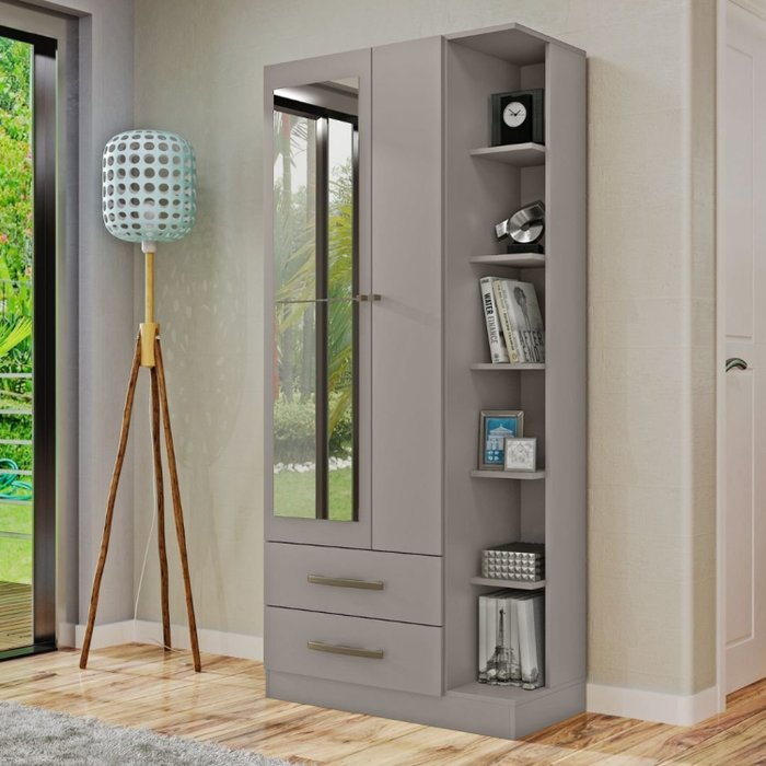 Guarda-roupa Solteiro 1 Espelho 2 Portas 2 Gavetas e Prateleiras Moju Ardósia