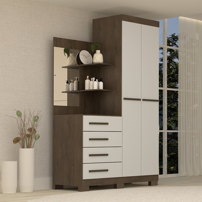 Guarda Roupa Solteiro 2 Portas 4 Gavetas com Espelho 100% MDF Melissa Café/Off White