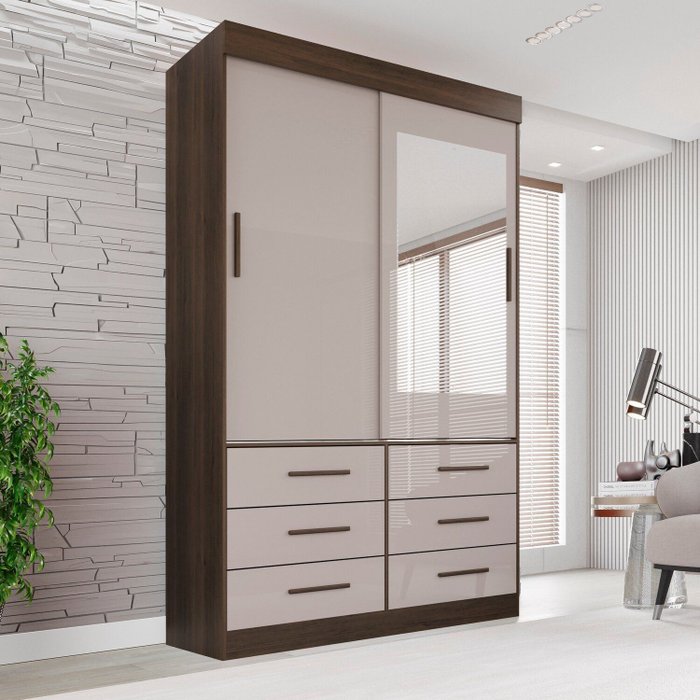 Guarda Roupa Solteiro 2 Portas com Espelho 6 Gavetas Luana