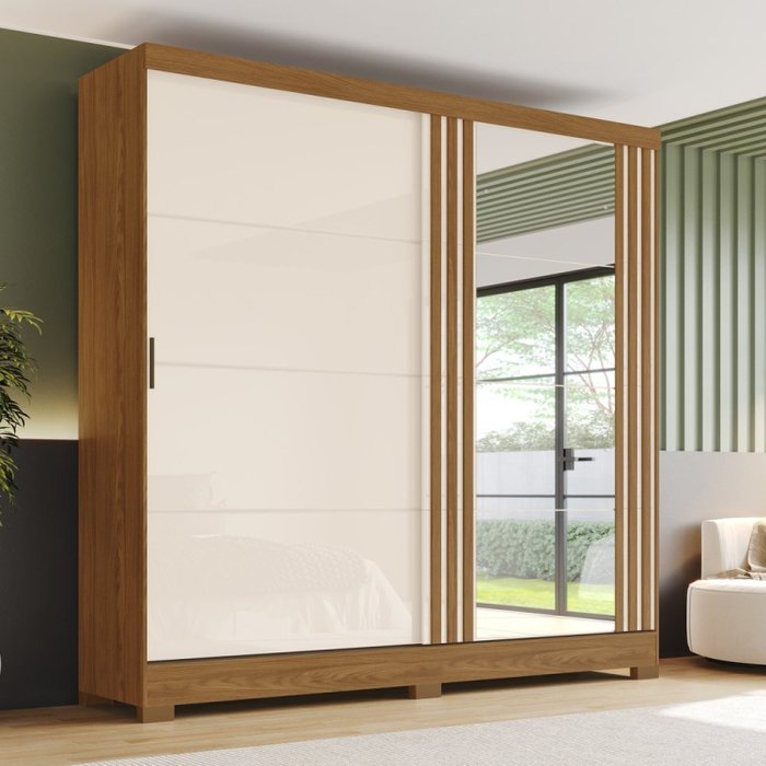 Guarda-roupa Solteiro 2 Portas de Correr 3 Gavetas com Espelho B352 Off White/Nature
