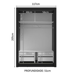 Medidas totais: 205 cm de altura x 117 cm de largura x 51 cm de profundidade.