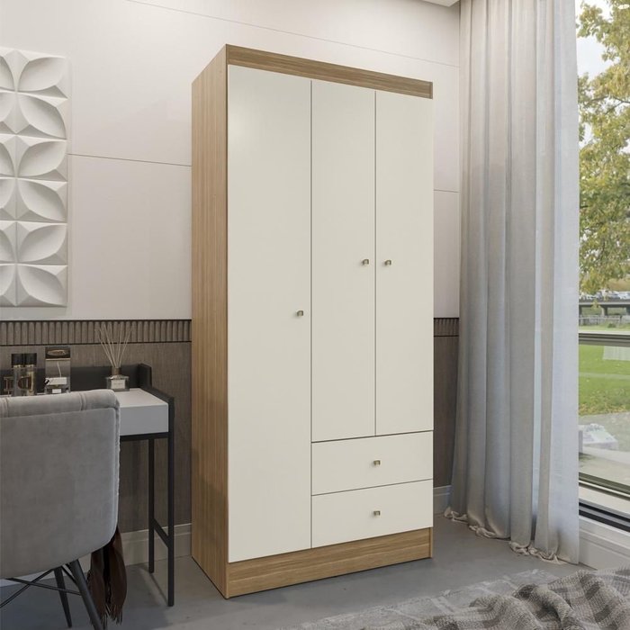 Guarda Roupa Solteiro 3 Portas 2 Gavetas Venti - Freijó/off White