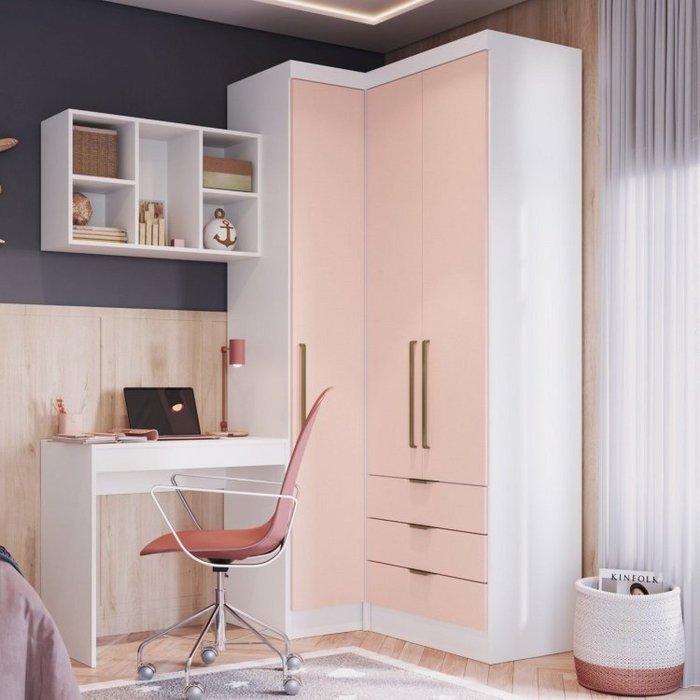 - Guarda-roupa de canto: o guarda-roupa de canto é desenvolvido para usar de forma inteligente os espaços de duas paredes, aproveitando, inclusive, os cantos. Ideal para quem não tem muito espaço disponível ou para quem quer otimizar todos os espaços da melhor forma.