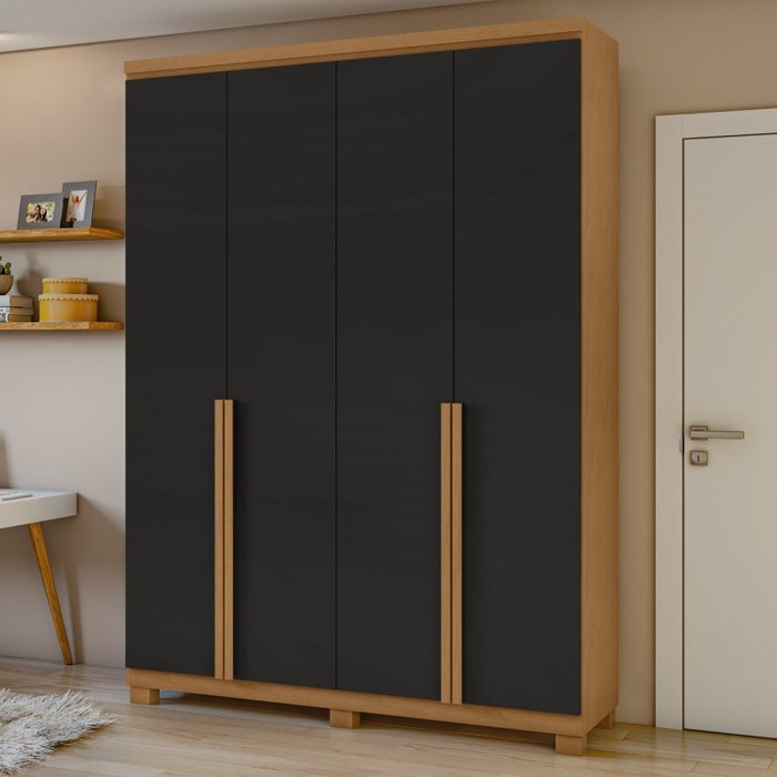 Guarda Roupa Solteiro 4 Portas 2 Gavetas Alonzo Móveis Lopas Amêndoa Clean/Preto Fosco