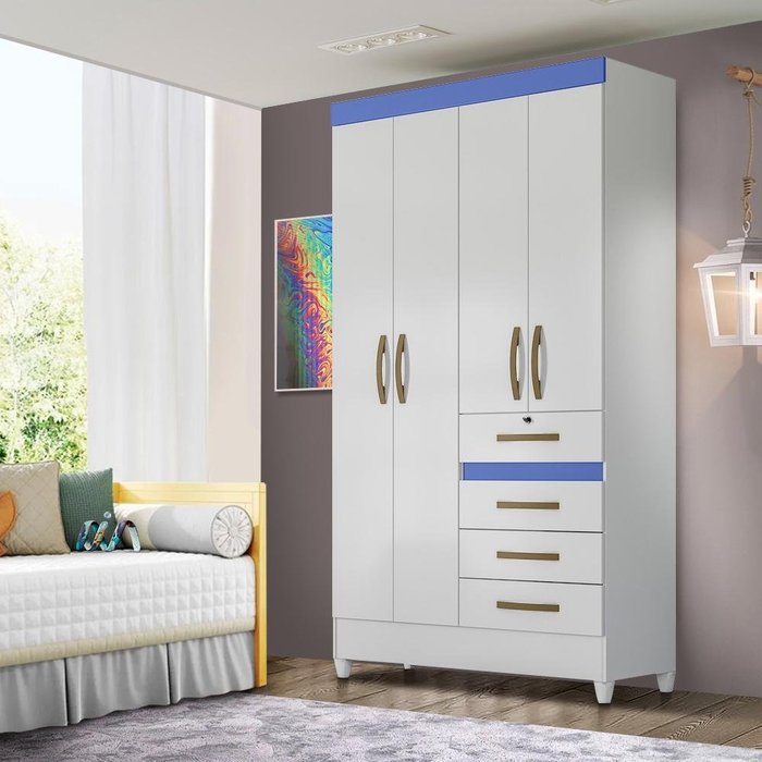 Guarda Roupa Solteiro 4 Portas 4 Gavetas Branco Azul Flex Silver Shop JM Branco Azul