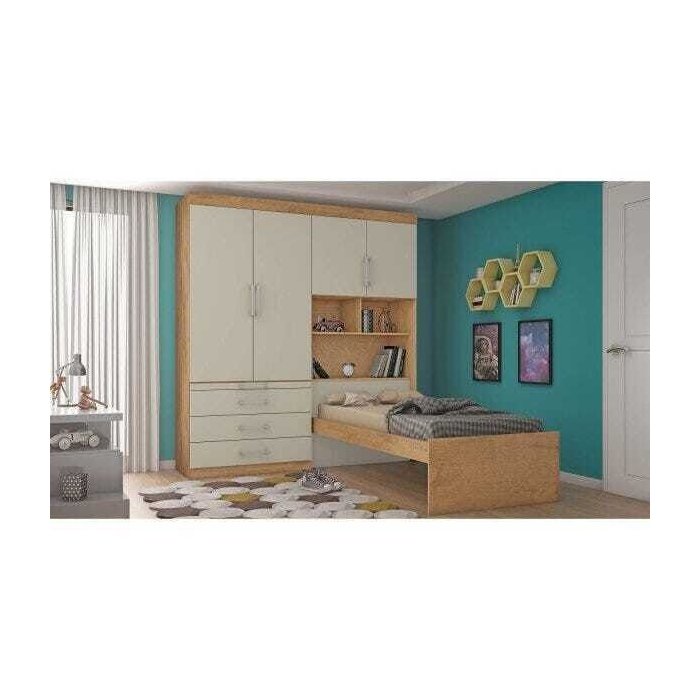 Guarda-roupa Solteiro 4 Portas com Cama Baú Lyon e Mesa Retrátil Móveis Europa Amêndoa/Off White